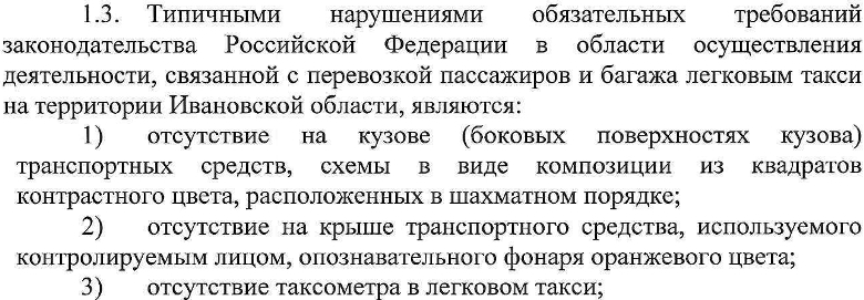 Департамент дорожного хозяйства и транспорта Ивановской области приказом от 12 марта 2024 года обновил свой список типичных нарушений обязательных требований законодательства РФ ивановскими таксистами, которые по версии чиновников создают риски материального ущерба, загрязнения окружающей среды, причинения вреда здоровью и гибели человека.