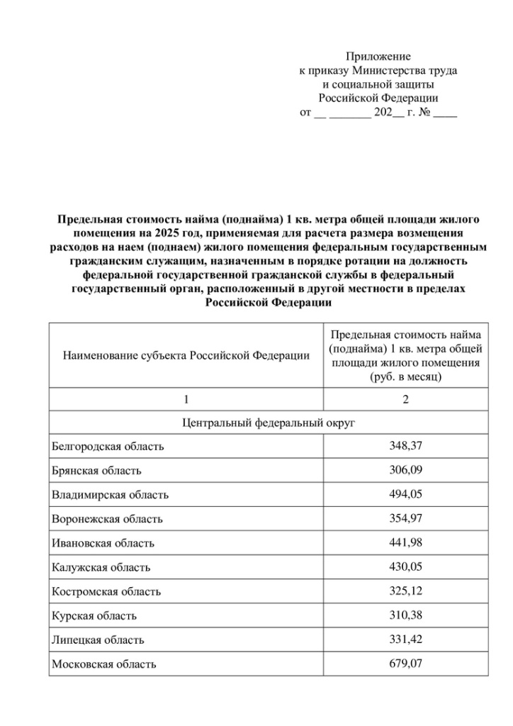 Минтруд России разработал проект приказа «Об утверждении предельной стоимости найма (поднайма) 1 кв. метра общей площади жилого помещения на 2025 год, применяемой для расчета размера возмещения расходов на наем (поднаем) жилого помещения федеральным государственным гражданским служащим, назначенным в порядке ротации на должность федеральной государственной гражданской службы в федеральный государственный орган, расположенный в другой местности в пределах Российской Федерации».
