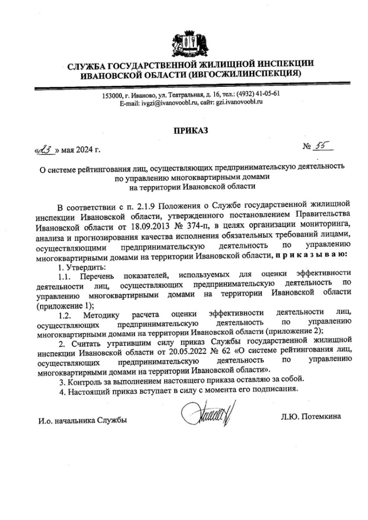 Согласно приказу Ивгосжилинспекции Автор: Александр Элькинд Служба государственной жилищной инспекции Ивановской области приказом от 23 мая 2024 года актуализировала систему рейтингования лиц,