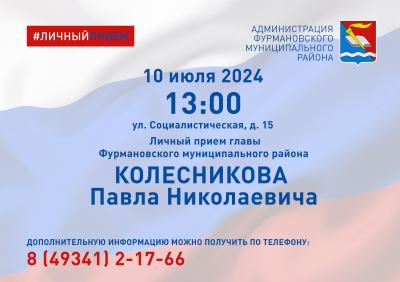 10 июля 2024 года в 13.00 состоится личный прием главы Фурмановского муниципального района Колесникова П.Н.