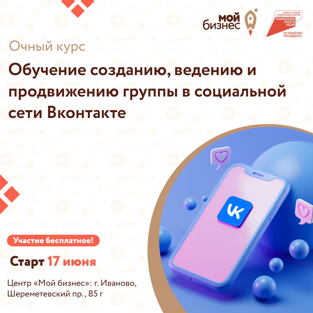 Центр «Мой бизнес» приглашает самозанятых граждан Ивановской области пройти очный курс по обучению созданию и ведению группы в социальной сети Вконтакте, а также продвижению группы малобюджетными способами.