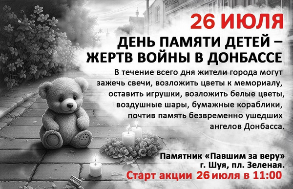 Приглашаем жителей города принять участие в акции памяти детей-жертв войны в Донбассе, которая стартует 26 июля в 11:00 у памятника «Павшим за веру». В течение всего дня жители города могут зажечь свечи, возложить цветы к мемориалу, оставить игрушки, белые шары, бумажные кораблики, почтив память безвременно ушедших ангелов Донбасса.