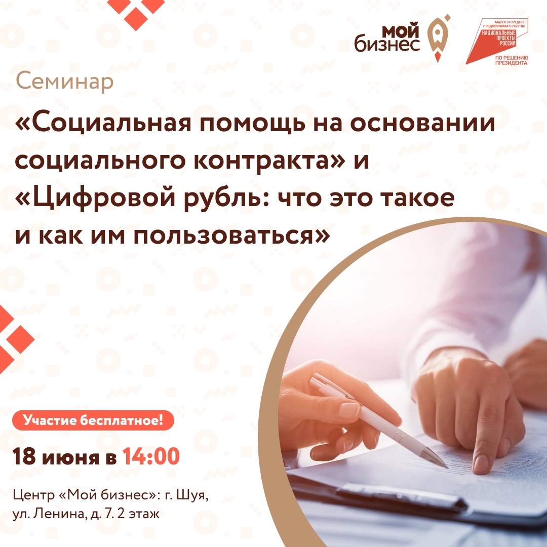 Участие в семинаре бесплатное, необходимо пройти регистрацию поссылке: https://forms.yandex.ru/cloud/66572cd502848f1353cb235e/ . Более подробную информацию о семинаре можно получить у специалистов муниципального офиса Центра «Мой бизнес» в г. Шуя по телефону: +7(49351)2-84-84.