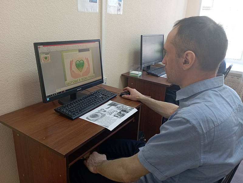 Каждому участнику было предложено сделать свой макет, посвященный здоровому образу жизни. Получатели услуг вспомнили работу с диалоговым окном, научились копировать и вставлять изображения, печатать текст и подбирать дизайн фона. В завершении занятия каждый продемонстрировал свою работу.