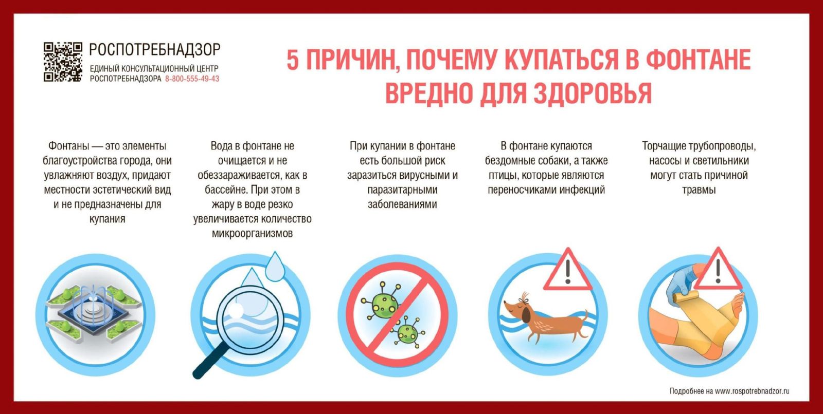 К тому же в чашу фонтана могут попасть грязь, пыль, насекомые и так далее. В такой воде в жару очень быстро размножаются энтеровирусы, стрептококки, стафилококки, кишечная палочка и другие возбудители. Также вода обрабатывается специальным раствором, препятствующим образованию водорослей, что тоже крайне опасно для человека.
